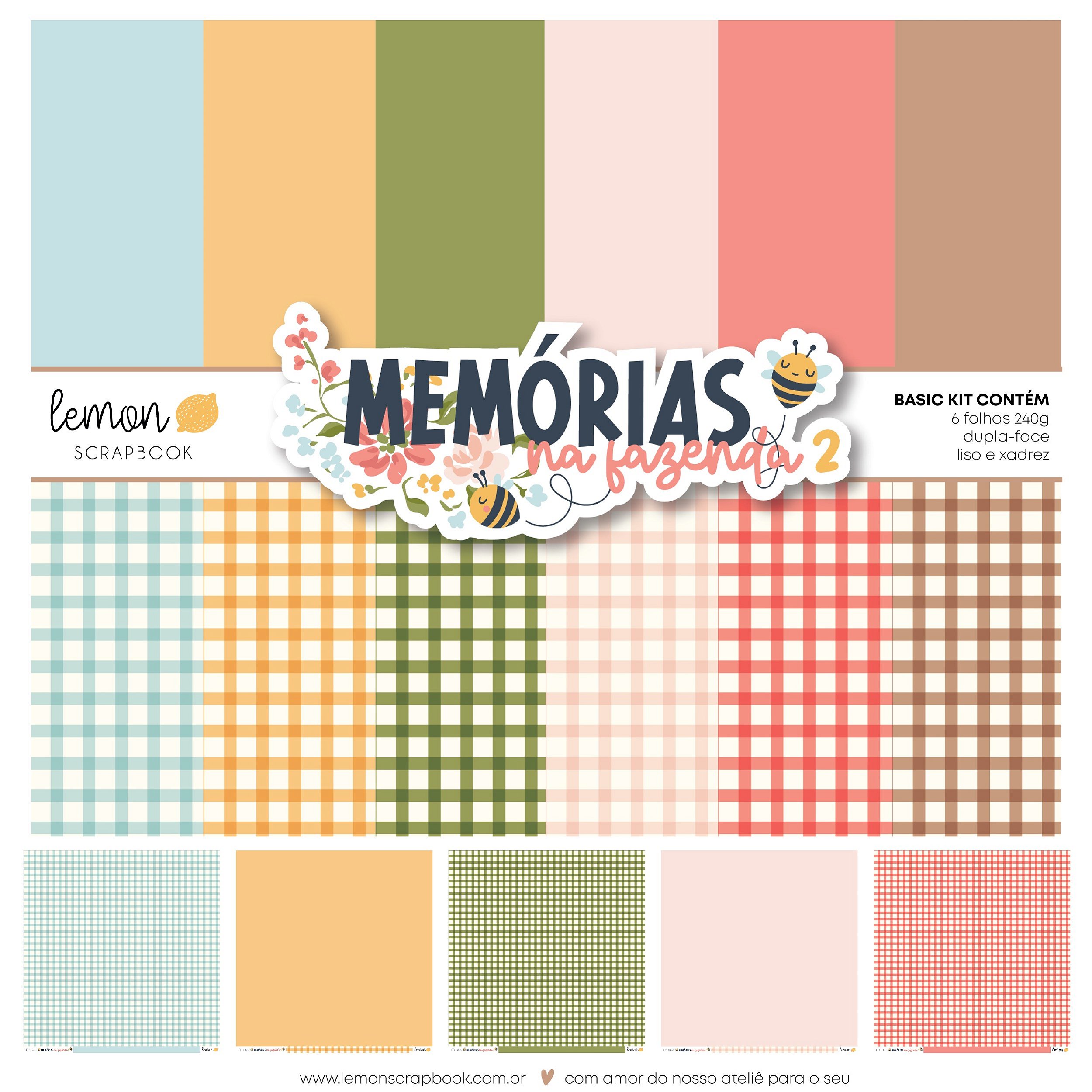 O Basic Kit contém 6 folhas lisas/xadrex da linha Memórias na Fazenda 2.