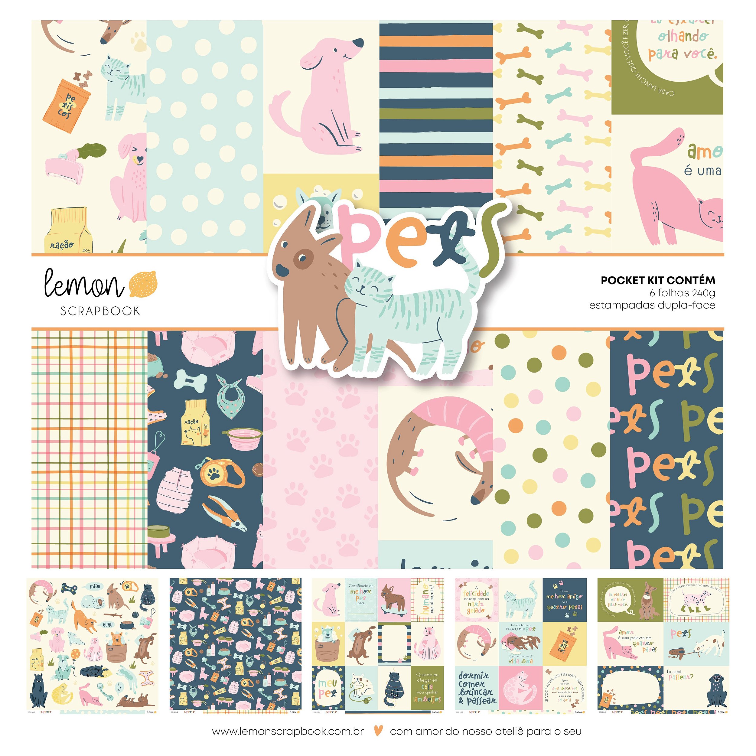 O Kit com 6 folhas contém uma folha de cada estampa da linha Pets.