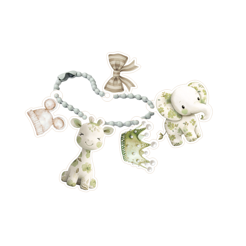 Tamanhos: Girafa 3,8x6,3cm ; Elefanta 4,9x5,1cm ; coroa 3,2x4,7cm ; laço 2,8x4,1cm ; toca 3,5x4,2cm