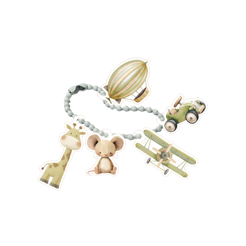 Tamanho: Girafa 2,4x6,3cm ; rato 3,2x3,8cm ; dirigível 3,5x5cm ; carrinho 2,7x4,2cm ; avião 2,7x2,7cm