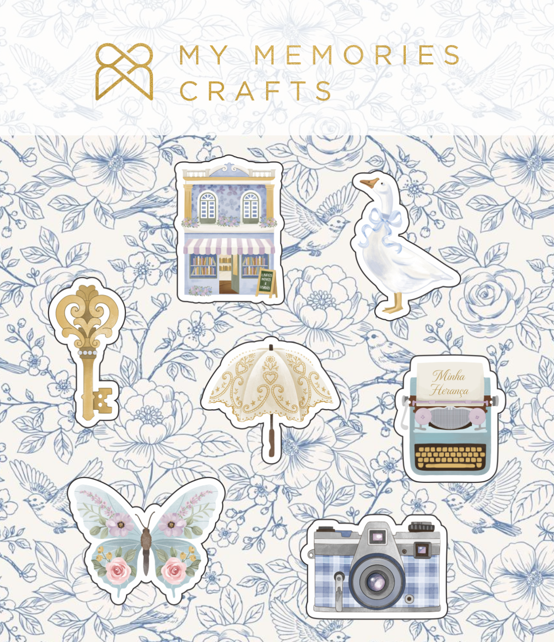 Kit com 7 elementos da coleção Minha Herança, com tamanho médio de 3x2cm, com acabamento em acrílico e verso adesivado para facilitar e inspirar na hora de produzir.
