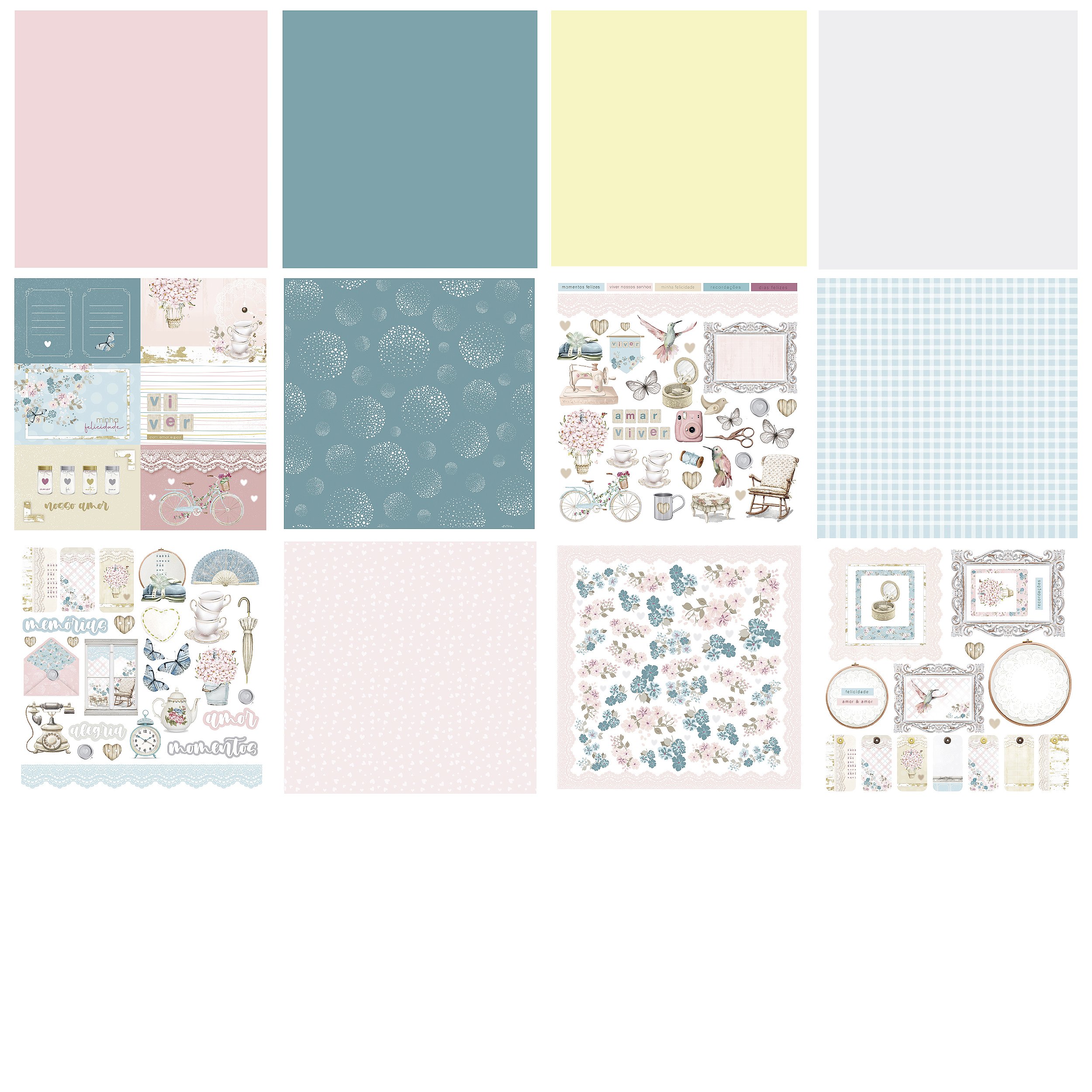 Dimensões: 305 x 315 mm A coleção Doce Maria foi desenvolvida seguindo traços do estilo shabby chic, com traços modernos. Mistura conceito planos (flat design) e realismo. Uma coleção de 14 páginas