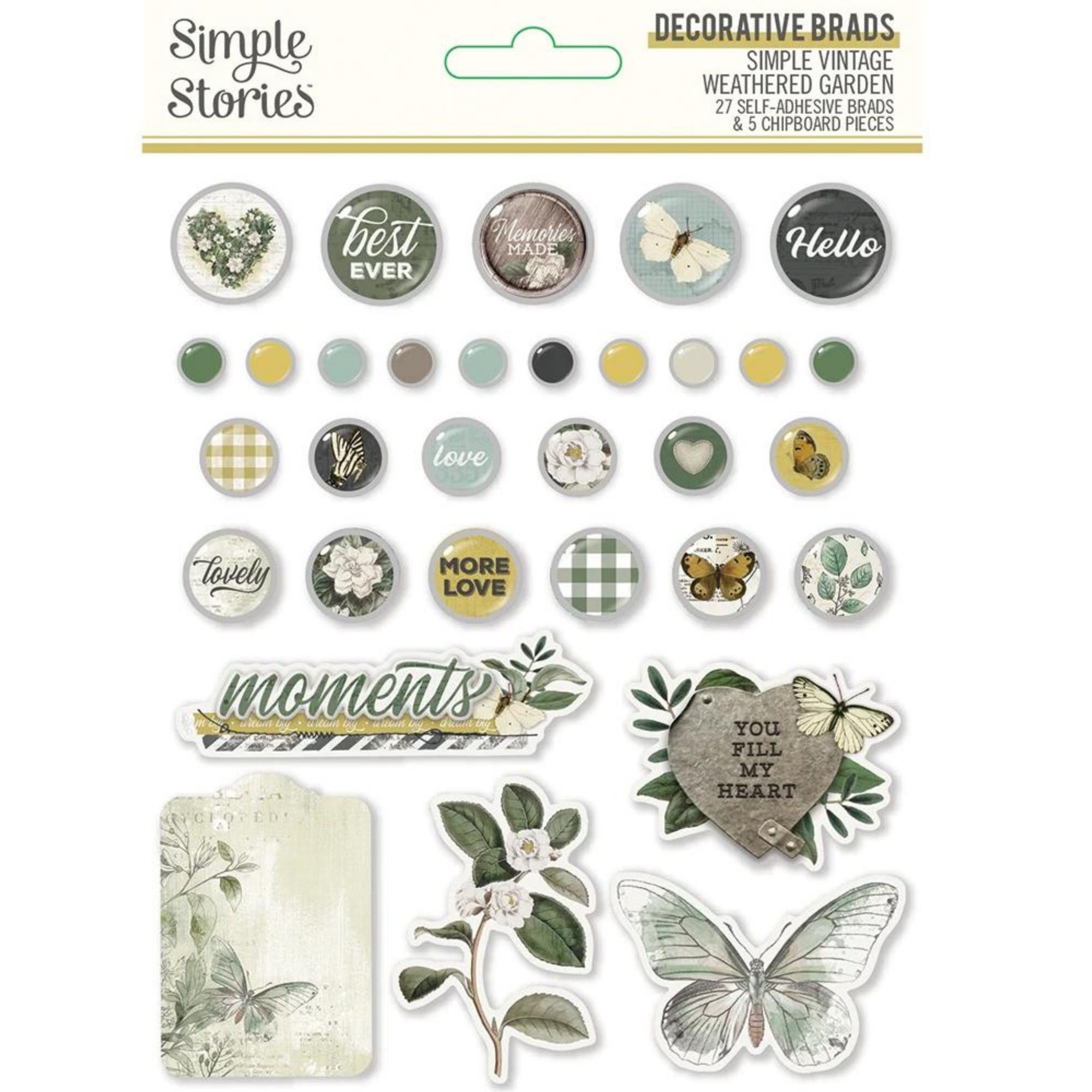 Contem 27 brads + 5 recortes em chipboard.